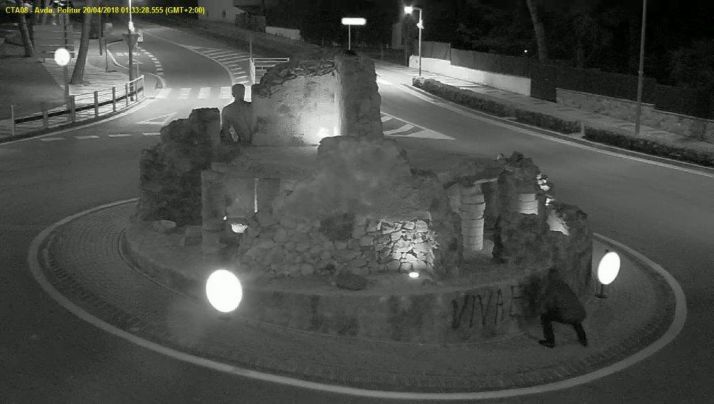 Els fets van passar la matinada de dijous a divendres passat i l'home se'l va enganxar, com es veu a la imatge, 'in fraganti'. Estava pintant la rotonda que hi ha davant les restes romanes de Palol.