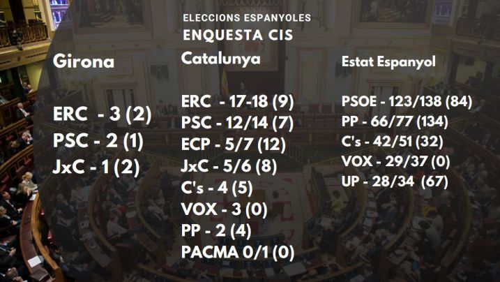 ERC guanyaria les eleccions espanyoles a Girona amb 3 diputats segons el sondeig del CIS. El Centre d'Investigacions Sociològiques Espanyol vaticina també un augment del PSC que guanyaria un escó i un retrocés de JxC que perdria un dels diptuats que té actualment a Madrid. Ni C's ni PP obtindrien representació gironina en una enquesta en la que no s'ha preguntat pel Front Republicà, perquè en el moment de fer-se encara no s'havia creat la coalició.